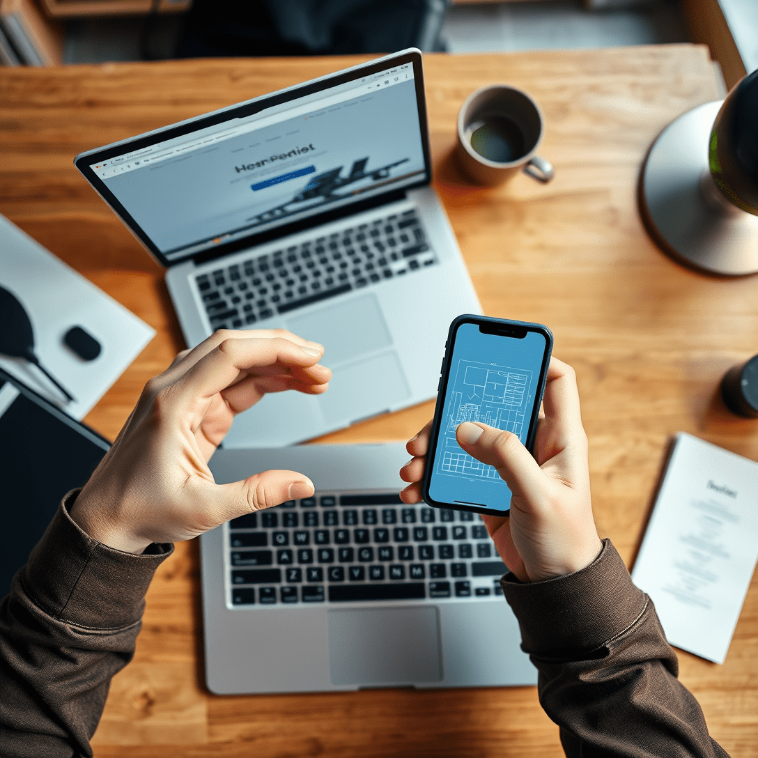 Manos de un empresario entre un portátil con una web y un móvil con el plano de una app sobre un escritorio.